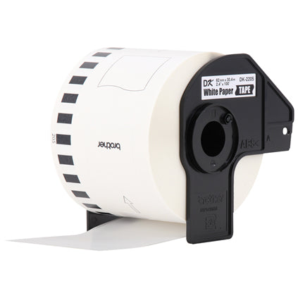 Brother DK-2205 labels have been developed to work in harmony with your Brother QL label printer. They are available in (2.4 in x 100ft) continuous White Paper Label rolls providing enough custom-length labels for even the most complex labeling project. DK labels can be used for storage boxes, shipping packages, binders, envelopes, and more.