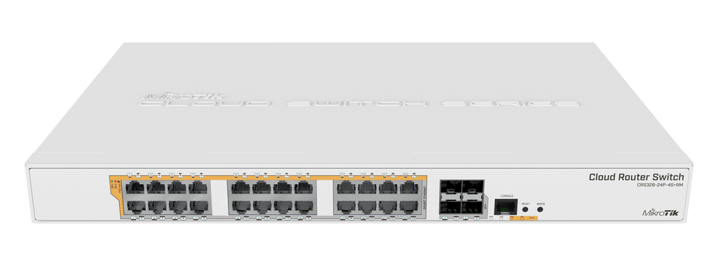 CRS328-24P-4S+RM is a 28 independent port switch, it has 24 Gigabit Ethernet ports, which offer different power output options: Passive PoE, low voltage PoE, 802.3af/at (Type 1 “PoE” / Type 2 “PoE+”) with auto-sensing. PoE-Out is passed over mode B pins (4,5+)(7,8-). The four SFP+ ports provide up to 10 Gbps connectivity options via either optical fiber or Ethernet modules (not included).