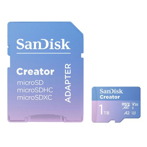 Capture. Create. Make your mark.Bring your vision to life with the SanDisk Creator microSD™ UHS-I card with Adapter. Capture stunning 4K and 5.3K footage effortlessly with pro-level performance. And with up to 1TB of storage, you can focus less on storage and more on chasing your next idea — whenever and wherever inspiration strikes. Once your shoot is wrapped, you can offload files at maximum speeds with a SanDisk QuickFlow™ microSD™ UHS-I Card USB-A Reader (sold separately). Then, elevate your creative content with a three-month membership to Adobe Lightroom, on us. From raw footage to final cut, SanDisk supports every step of your creative journey.