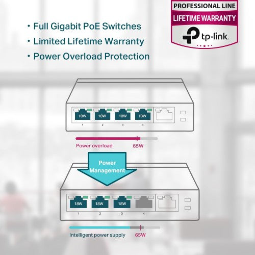 - Supports PoE Power up to 65W for all PoE ports