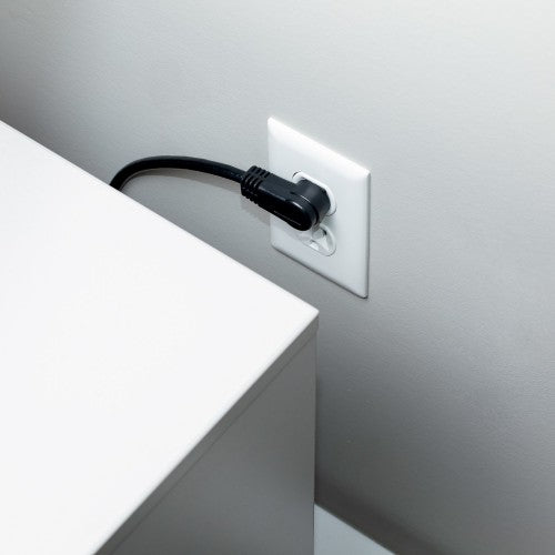 The right-angle power cord enables access to previously blocked receptacles, located on power strips, surge protectors, or wall outlets. Since the cable is situated to the side of the outlet, bulky plugs will no longer impede access to nearby receptacles.