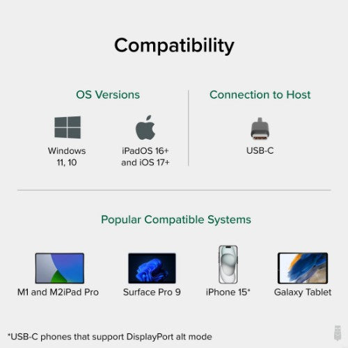 CompatibilityWindows 10+, iPad M1+ with iPadOS 16+ (iPadOS 16.1+ for Stage Manager), USB-C phones/tablets with DisplayLink Alt Mode, like the Samsung Galaxy S22.