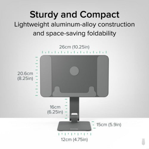 - Particularly Portable—The magnetic tablet stand folds flat for easy transport. Perfect for traveling professionals and students. Made of lightweight aluminum alloy with space-saving foldability so you can find productivity anywhere