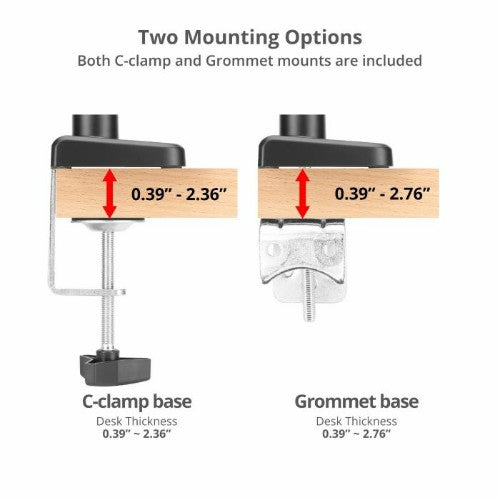 Two Mounting OptionsC-clamp and Grommet bases are both included in the package for a quick and easy installation -Solid C-clamp fits most desktops from 0.39" to 2.36” thick -Grommet mount supports up to 2.76" thick with a Grommet hole diameter between 0.39” to 2.36”