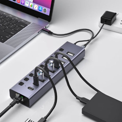 - User-Friendly Features: The separate ON/OFF switch allows for easy power management, enabling users to turn off the hub when not in use, which can help save energy and reduce clutter