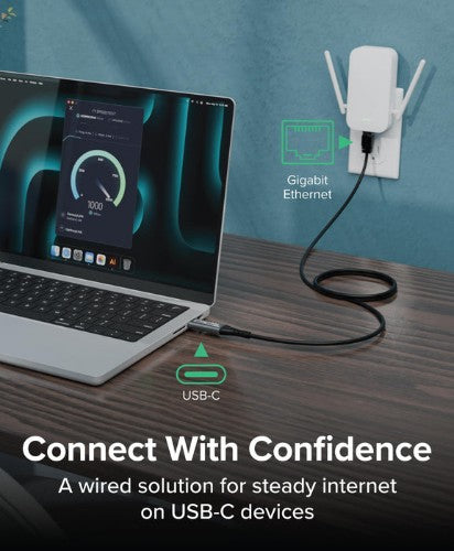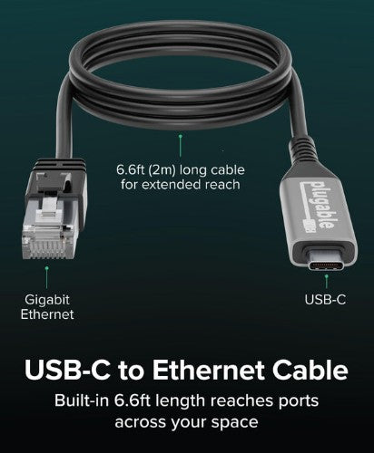 Reliable Wired InternetThe Plugable Ethernet to USB C Cable (USBC-E1000-2M) delivers dependable, high-speed Gigabit internet with a 2-meter (6ft) reach. Get a USB-C plug on one side, and a Gigabit Ethernet male connector on the other. Perfect for stable, secure networking at home, in the office.