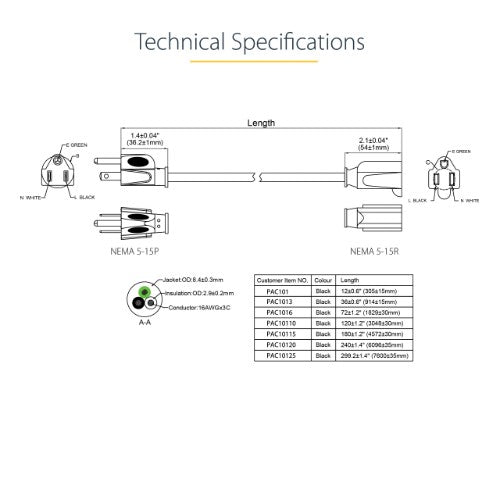 - SPECS: 6ft (2m) AC Power Cord / NEMA 5-15R to NEMA 5-15P / 16AWG / 125V 13A (Max) / Jacket Type: SJT / Jacket Material: PVC / Black / Temperature Range: 37°F to 140°F (3°C to 60°C) / Cable Outer Diameter: 0.33in (8.5mm)